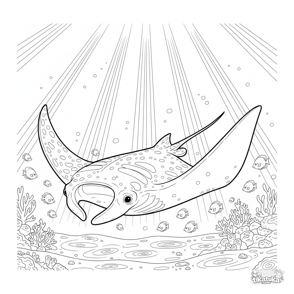 Página para colorir complexa para 10-12 anos: uma majestosa arraia-jamanta desliza entre pilares de luz solar em águas rasas. Cena detalhada com precisão anatômica.