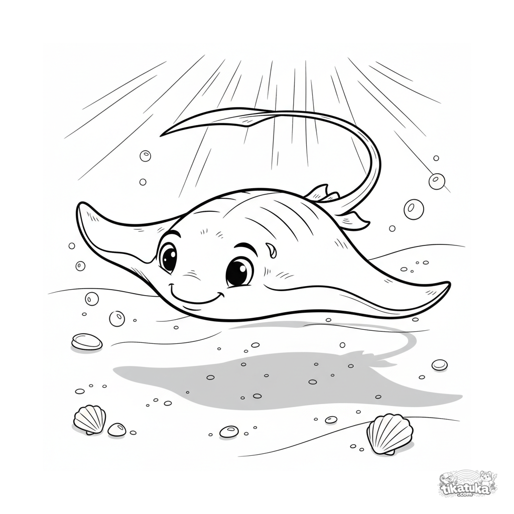 Página para colorir para crianças de 7 a 9 anos: uma arraia graciosa plana sobre o fundo arenoso em raios de sol em águas rasas.