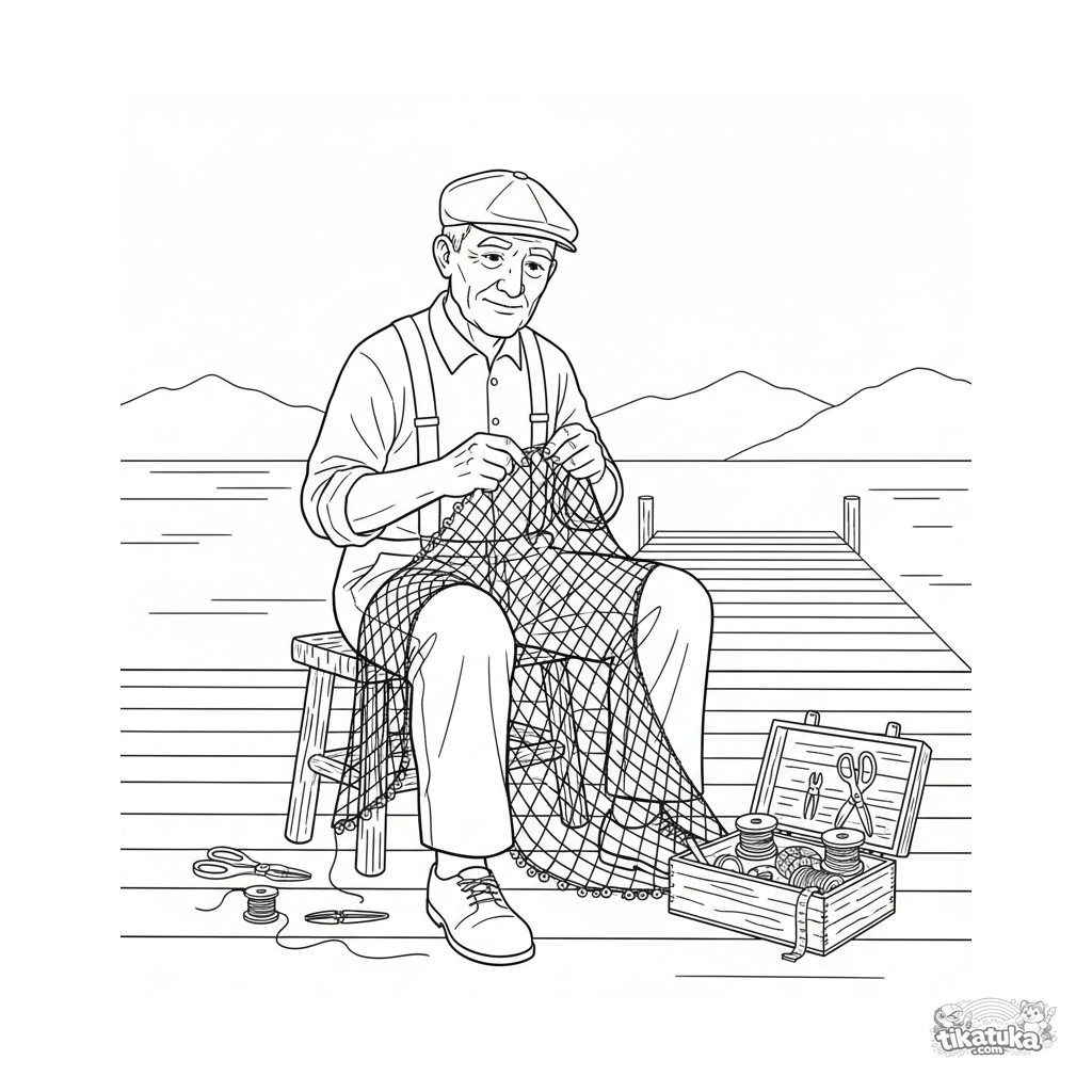 Página para colorir detalhada para 10-12 anos: um vovô consertando uma rede de pesca na varanda de um chalé à beira do lago. Cena com ferramentas e texturas.