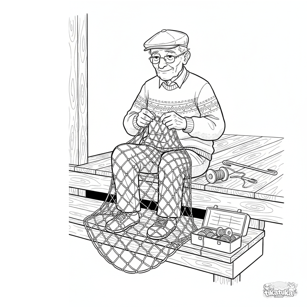 Página detalhada para colorir para crianças mais velhas de 10-12 anos: um vovô consertando uma rede de pesca sentado no degrau da varanda. Texturas complexas e atmosfera pacífica.