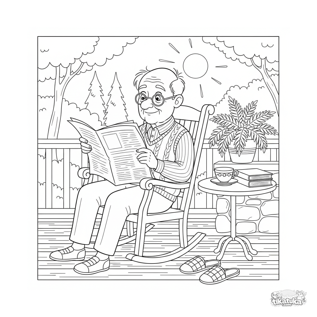 Página para colorir para crianças mais velhas de 10 a 12 anos: um avô de óculos lê jornal em uma cadeira de balanço em uma varanda aconchegante de verão.