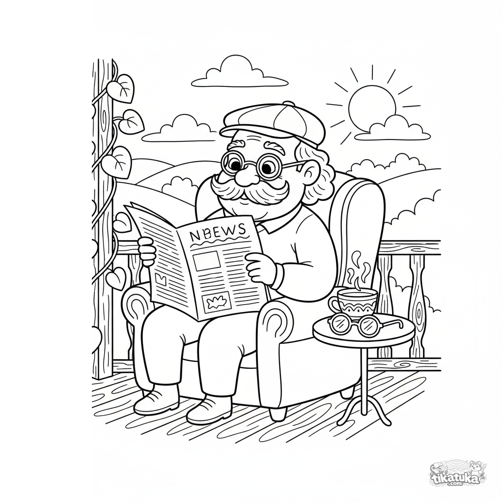 Página para colorir para crianças 7-9 anos: vovô lendo jornal na varanda, uma xícara de chá por perto. Cena aconchegante com detalhes.