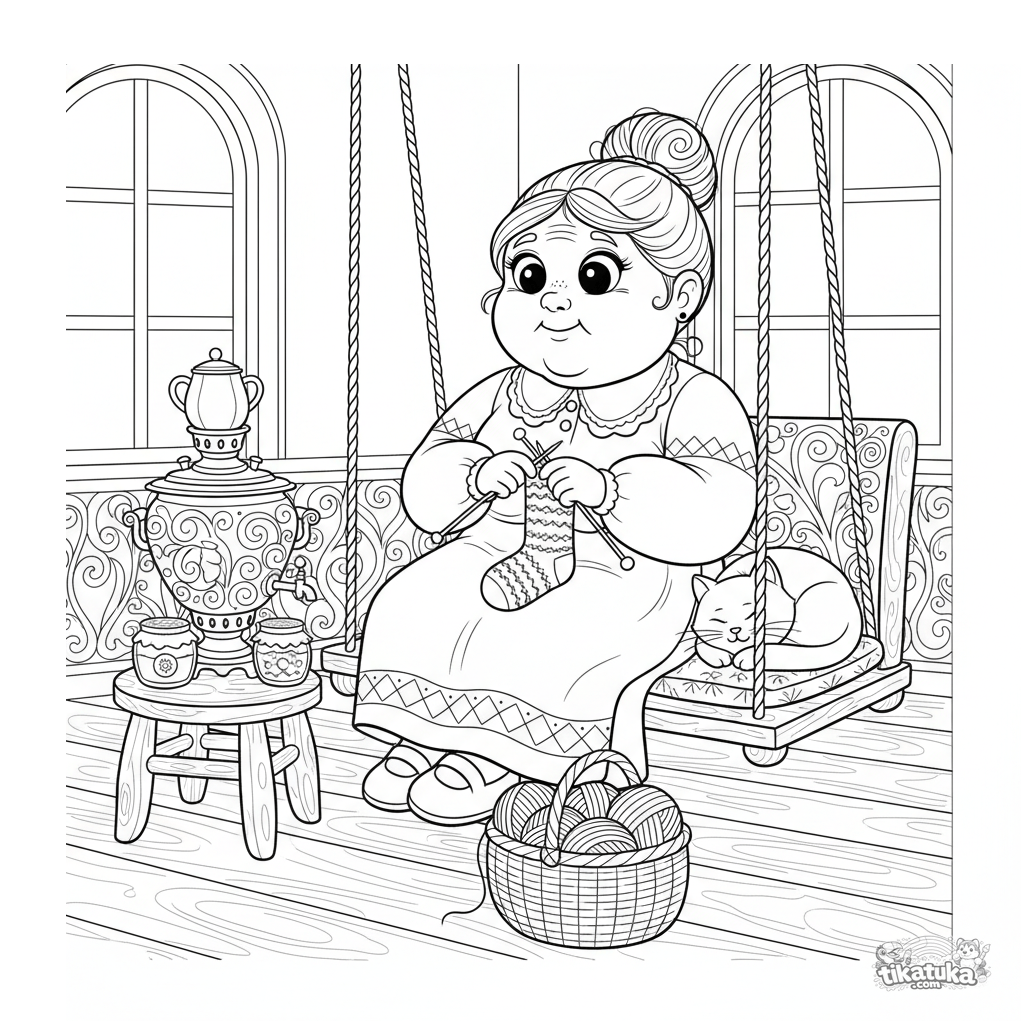 Página para colorir detalhada para crianças mais velhas 10-12 anos: uma avó tricota em uma rede suspensa. Muitos detalhes: novelos, samovar, geleia, gato. Estilo folclórico.
