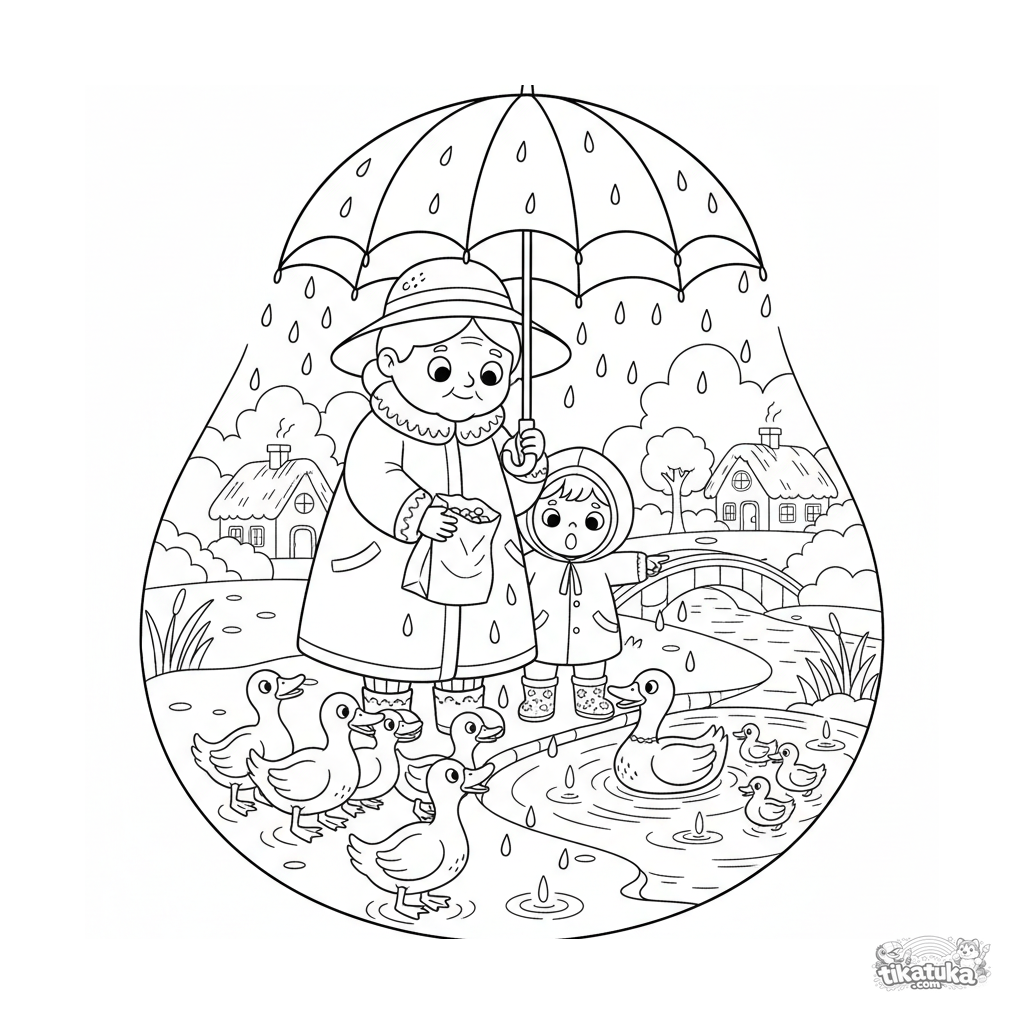Página para colorir para crianças de 4-6 anos: um avô com guarda-chuva e uma criança de botas alimentam patos em um lago de outono na chuva. Estilo folclórico.
