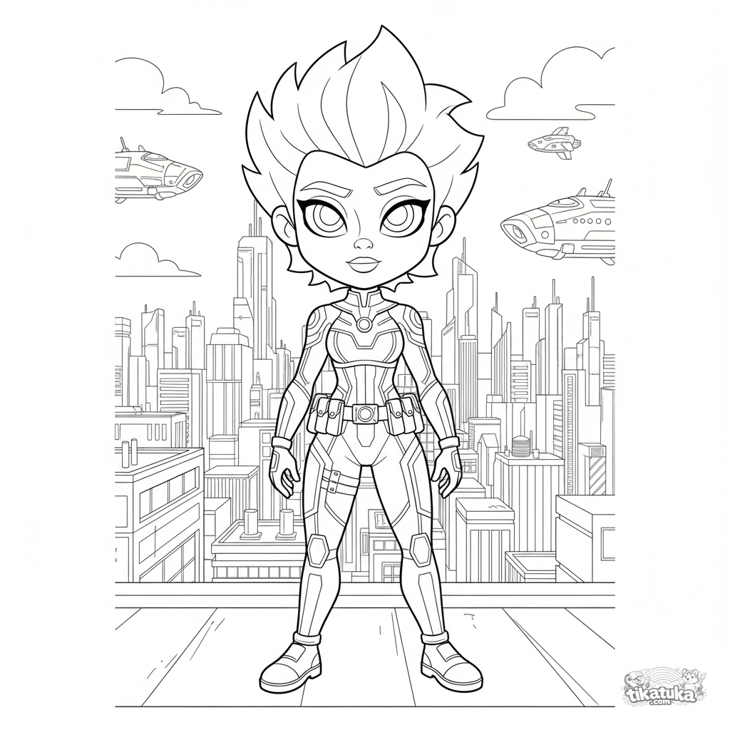 Página para colorir estilo graphic novel para 10-12 anos: heroína em macacão de ficção científica detalhado no telhado de uma cidade futurista.