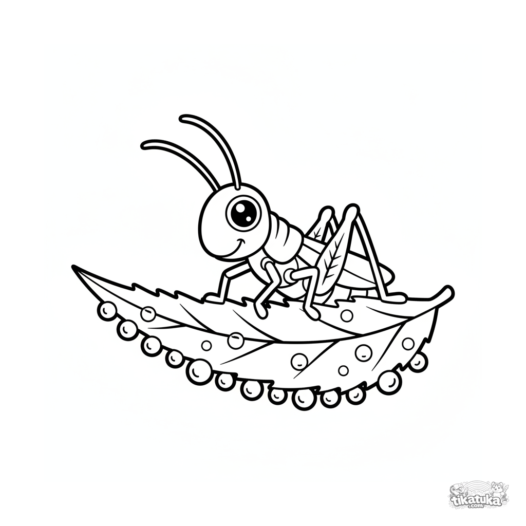 Página simples para colorir para crianças pequenas 2-3: um gafanhoto no estilo anos 90 brinca de esconde-esconde atrás de uma cortina de gotas de orvalho.