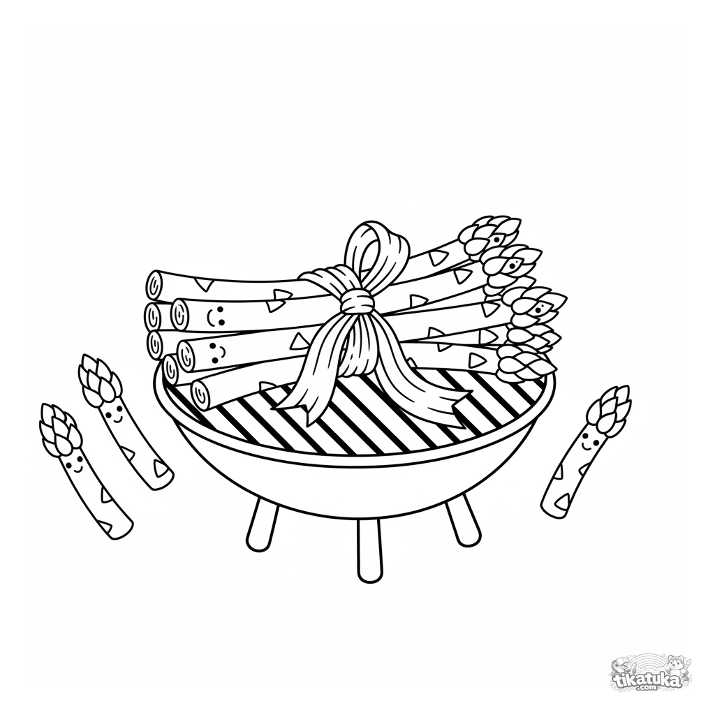 Página para colorir para crianças pequenas de 2-3 anos: um pacote simples de aspargos amarrado com alho-poró, em uma churrasqueira de jardim. Formas grandes e claras.