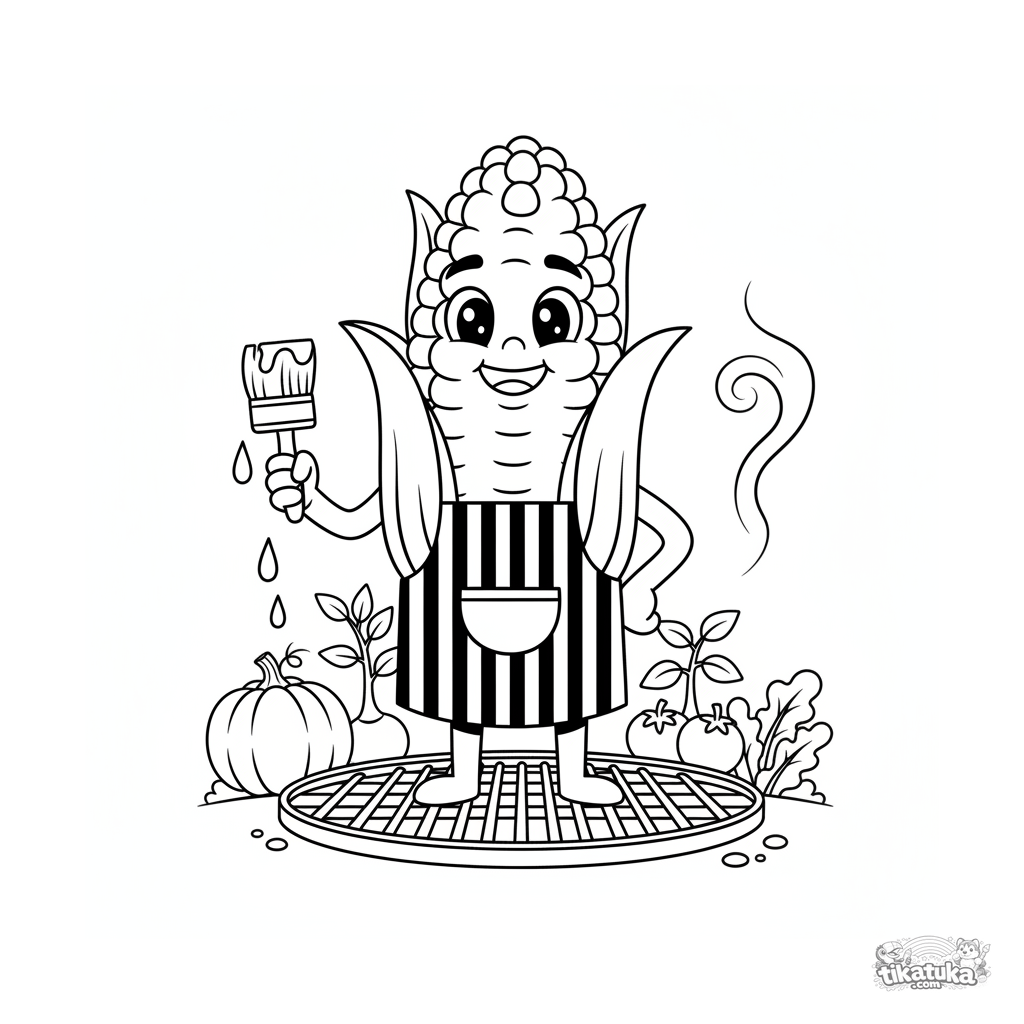 Página para colorir de milho grelhado para crianças 4-6. Uma espiga sorridente com avental se prepara em uma grelha de jardim.