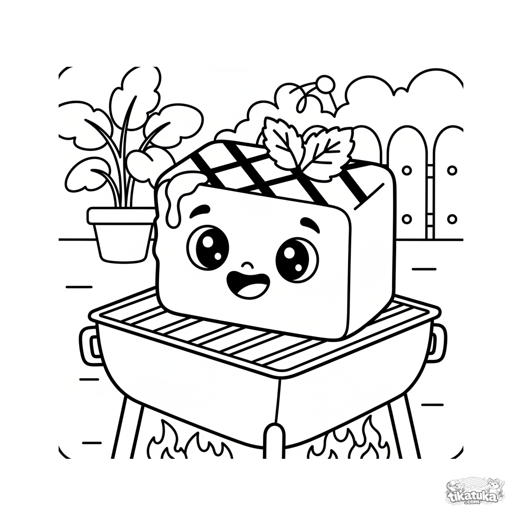 Página para colorir de queijo halloumi grelhado em um jardim. Com guarnição de hortelã. Para crianças de 4 a 6 anos. Formas geométricas limpas.
