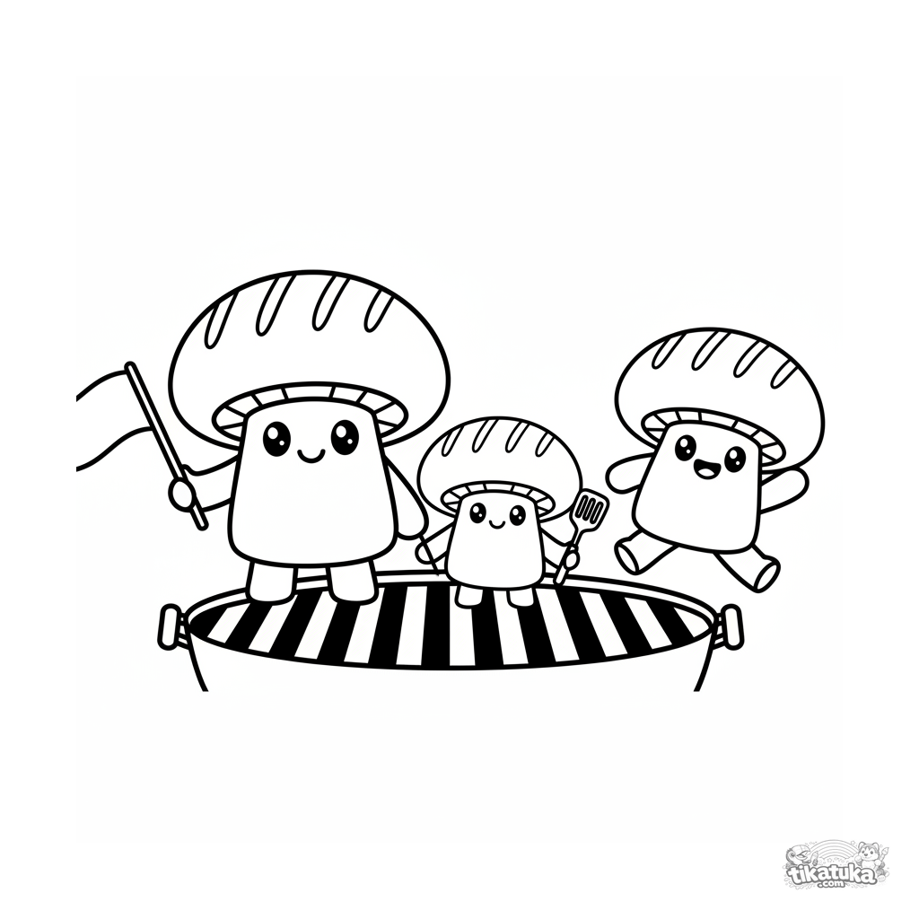 Página simples para colorir para bebês de 2 a 3 anos. Três cogumelos portobello alegres em pé em uma grelha acenam. Formas muito grandes e simples.