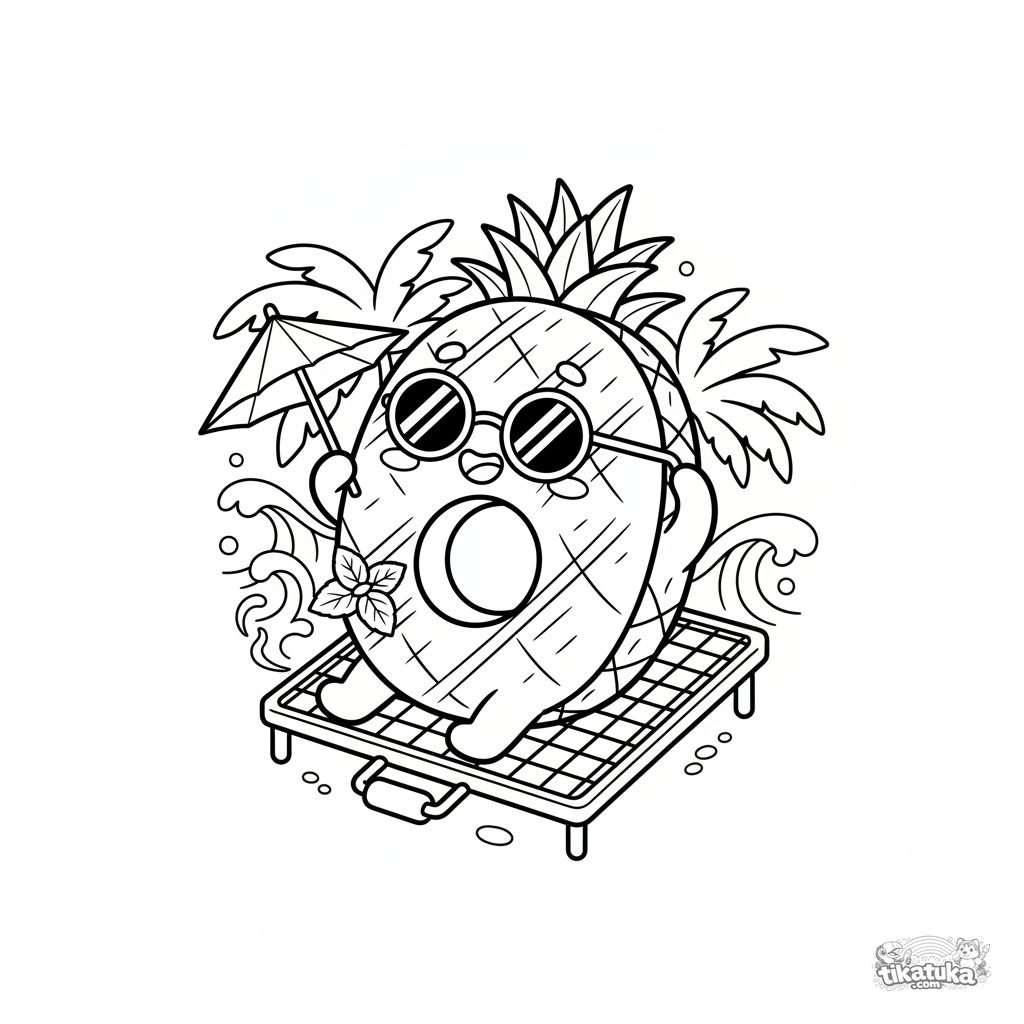 Página para colorir de um abacaxi na grelha para crianças de 7-9 anos. A rodela de abacaxi usa óculos de sol e segura um guarda-chuva, relaxando na grade.