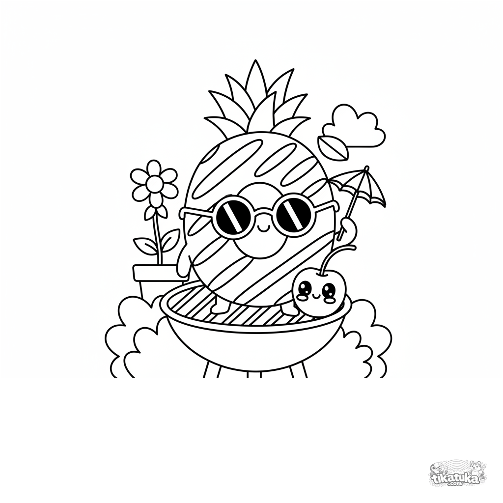 Página para colorir para crianças 4-6: um anel de abacaxi com óculos de sol e um guarda-chuva relaxando em uma grelha. Cena divertida e simples para imprimir.