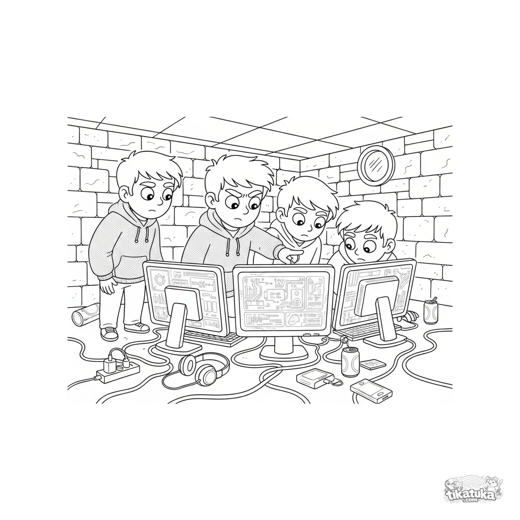 Página para colorir para crianças de 10-12 anos: uma equipe de jovens hackers colaborando em um porão cheio de monitores e cabos. Cena detalhada para colorir.
