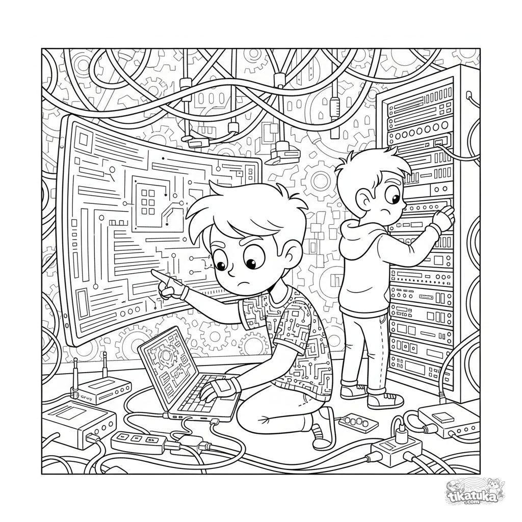 Página para colorir para crianças de 10-12 anos: uma dupla de hackers em um porão com telas, trabalhando em código. Cena complexa com cabos, servidores e fundo detalhado.