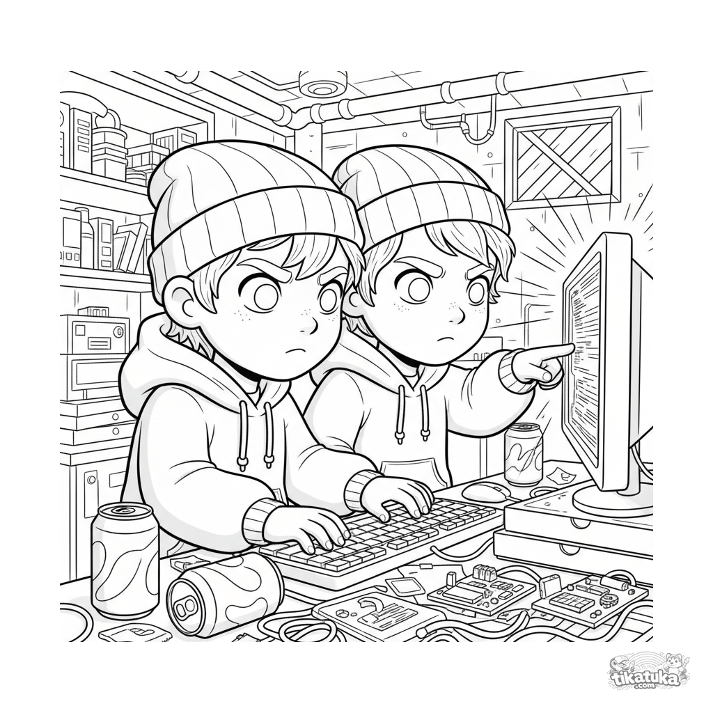 Página para colorir para crianças de 10-12 anos: uma dupla de hackers trabalhando em um terminal no porão. Cena detalhada com cabos, telas e latas.