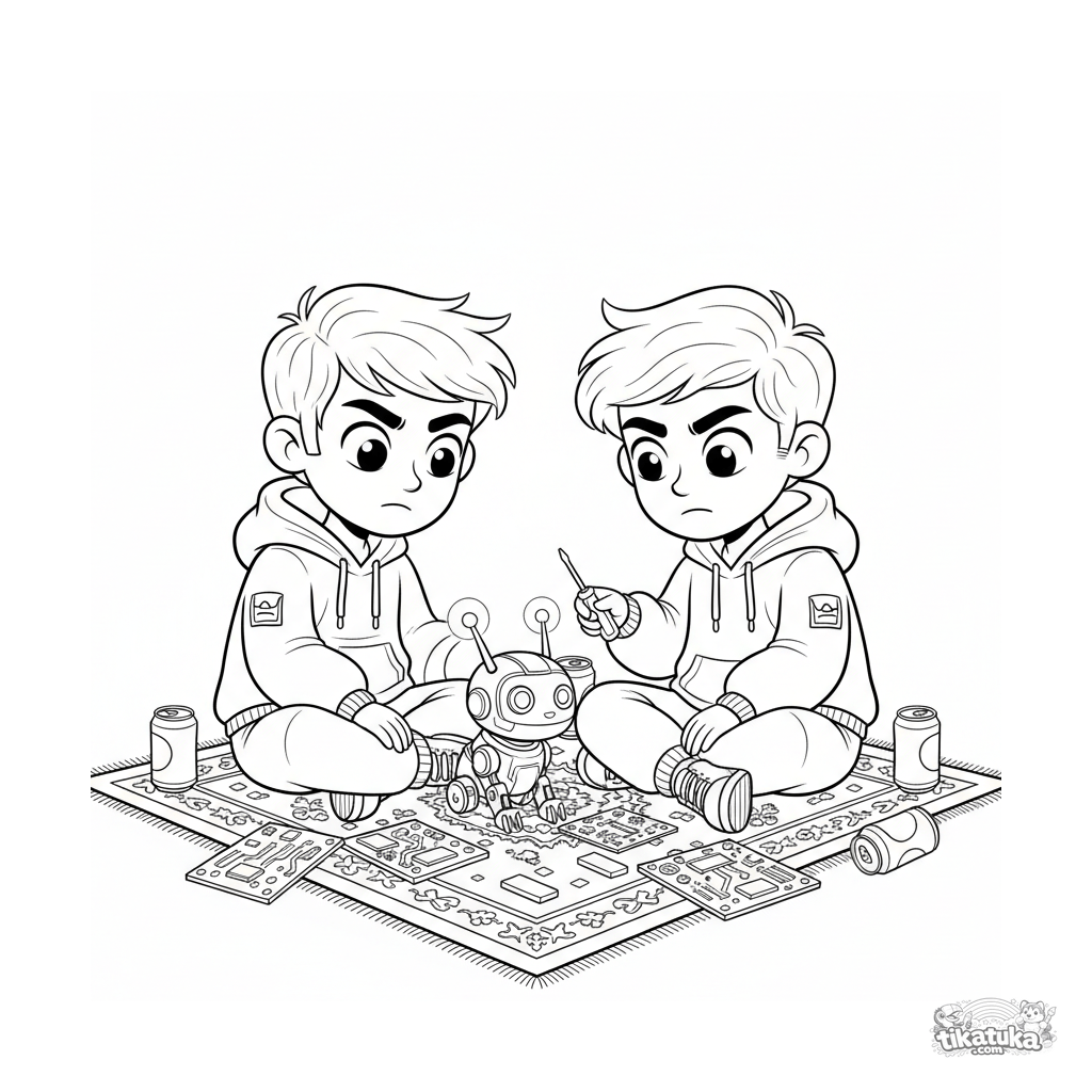 Página para colorir para 10-12 anos: dois adolescentes hackers em um porão mexendo em um animal de estimação cibernético entre placas de circuito. Cena de alto detalhe.