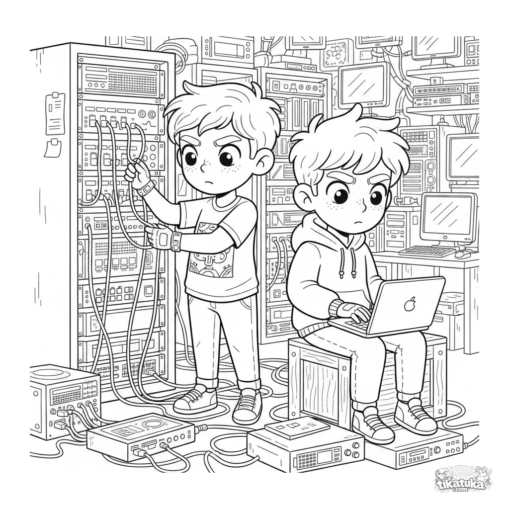 Página para colorir para crianças de 10-12 anos: dois adolescentes trabalham em equipamentos de servidor em um porão de hackers cheio de fios e telas piscando.