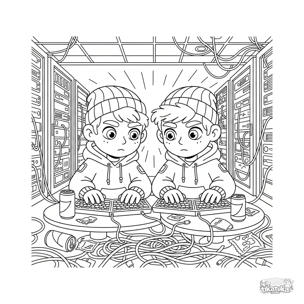 Página para colorir para 10-12 anos: dois hackers trabalhando em um terminal em um porão cheio de racks de servidores e cabos. Cena estilo graphic novel com alto detalhe.