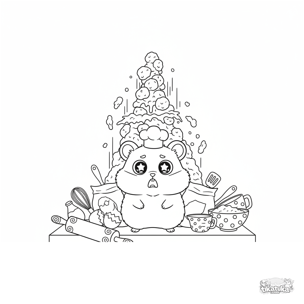 Página para colorir para crianças 7-12: um hamster com chapéu de chef parece chocado enquanto sua montanha de massa de biscoito desaba. Cena caótica e engraçada de fracasso épico.