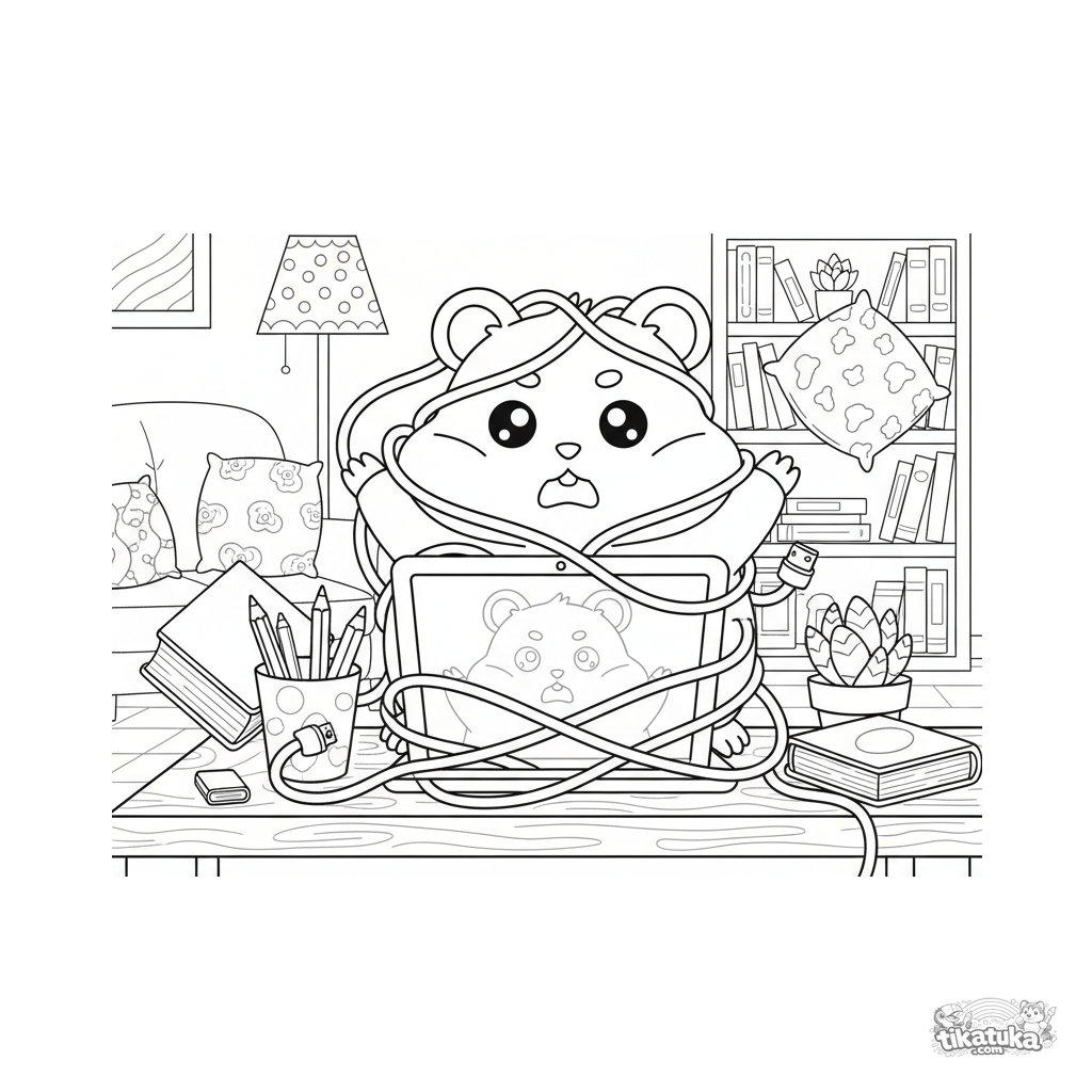 Página para colorir para crianças mais velhas: um hamster se enrola em cabos causando caos durante uma videchamada. Cena engraçada e detalhada no estilo anime.