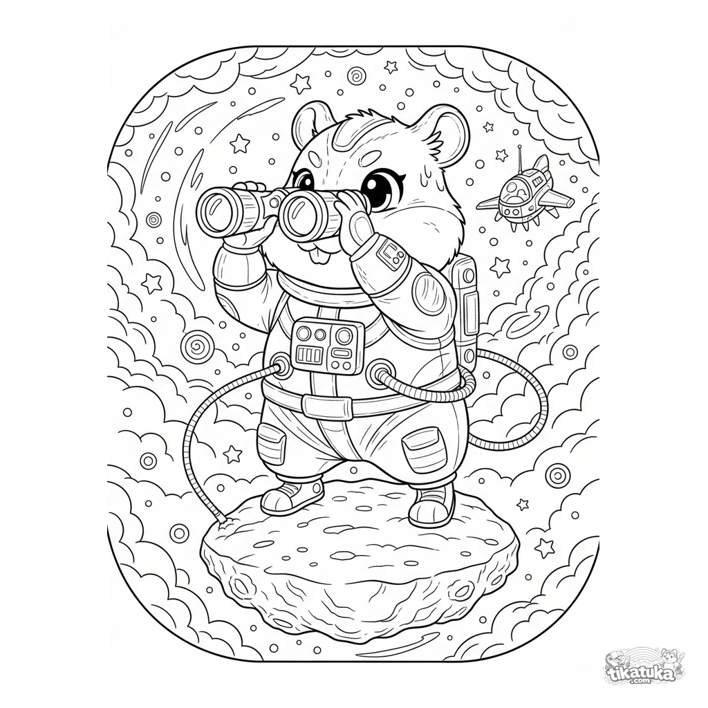 Página para colorir para crianças 10-12: um hamster em traje espacial num asteroide, escaneando o espaço com binóculos high-tech. Cena de meme espacial absurda e detalhada.