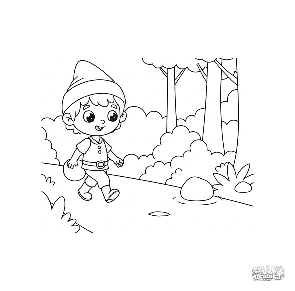 Página para colorir para crianças. Hansel caminhando pela trilha da floresta deixando uma pedrinha branca brilhante. Cena simples de conto de fadas. Download grátis.