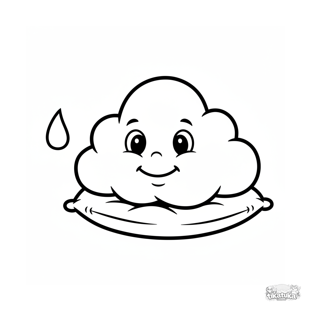 Página para colorir para os bem pequenos: uma nuvem sorridente descansa em uma almofada fofa. Formas muito simples e grandes.