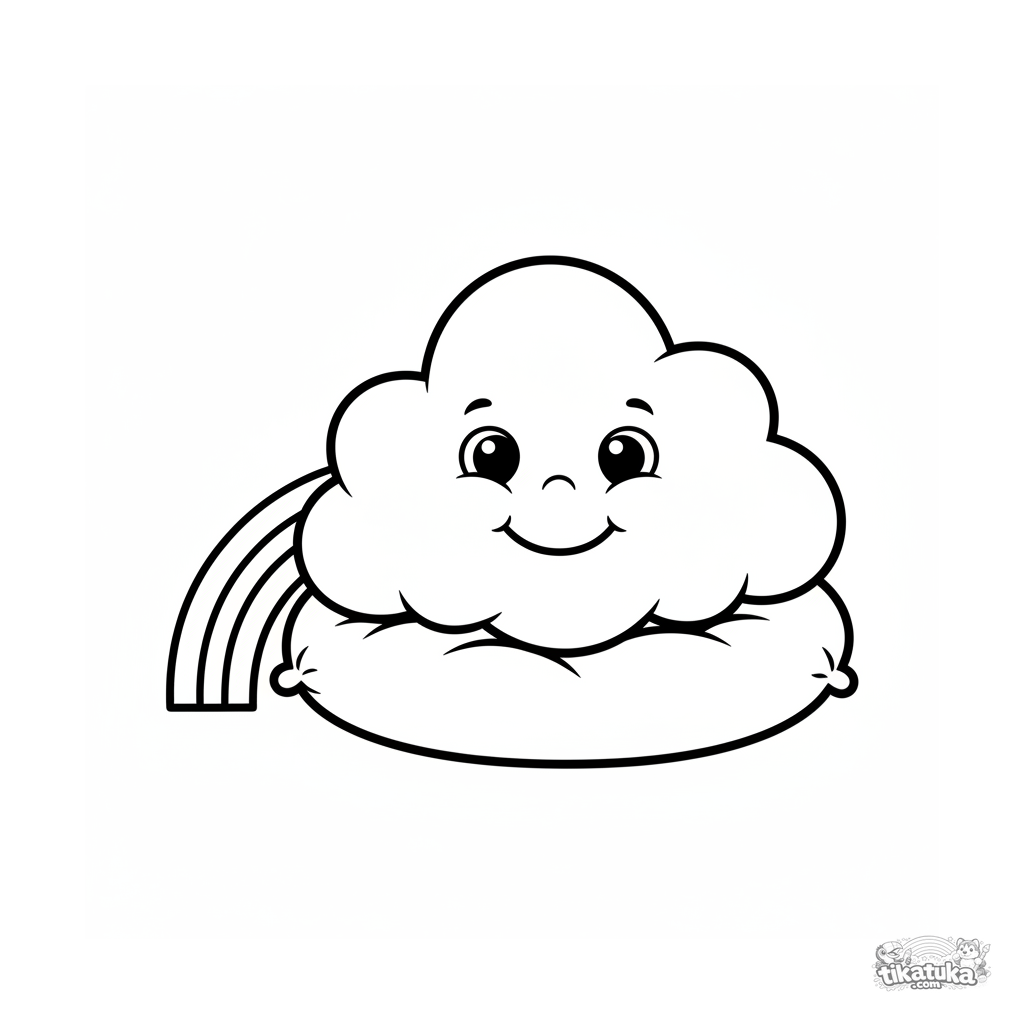 Página simples para colorir para crianças pequenas: uma nuvem sorridente com um arco-íris descansa em um travesseiro. Contornos grandes e claros, quase sem fundo.