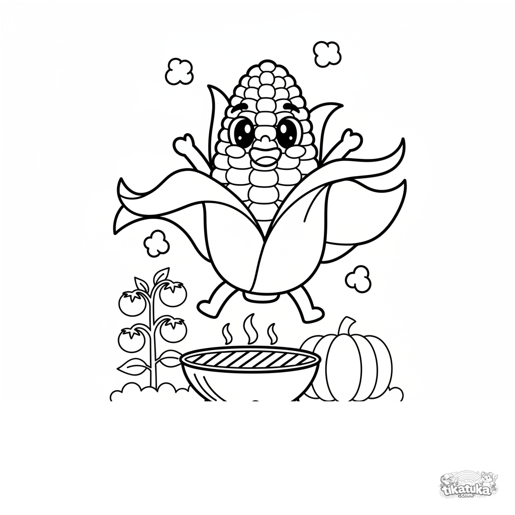 Página para colorir para crianças 7-9: uma espiga de milho feliz pulando de uma grelha de jardim. Imprima e pinte esta cena dinâmica.