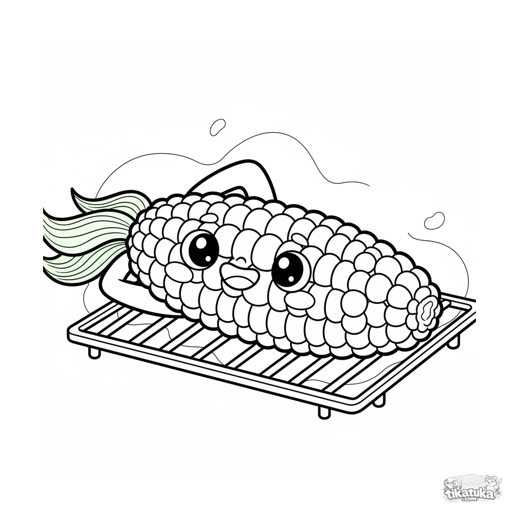 Página simples para bebês 2-3 anos: espiga de milho feliz na grelha do jardim. Formas grandes, poucos detalhes, margens brancas largas.