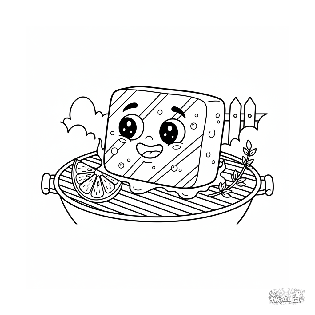 Página para colorir para crianças de 4-6 anos: queijo halloumi em uma churrasqueira de jardim. O queijo tem rosto amigável, marcas douradas da grelha, com limão e tomilho.