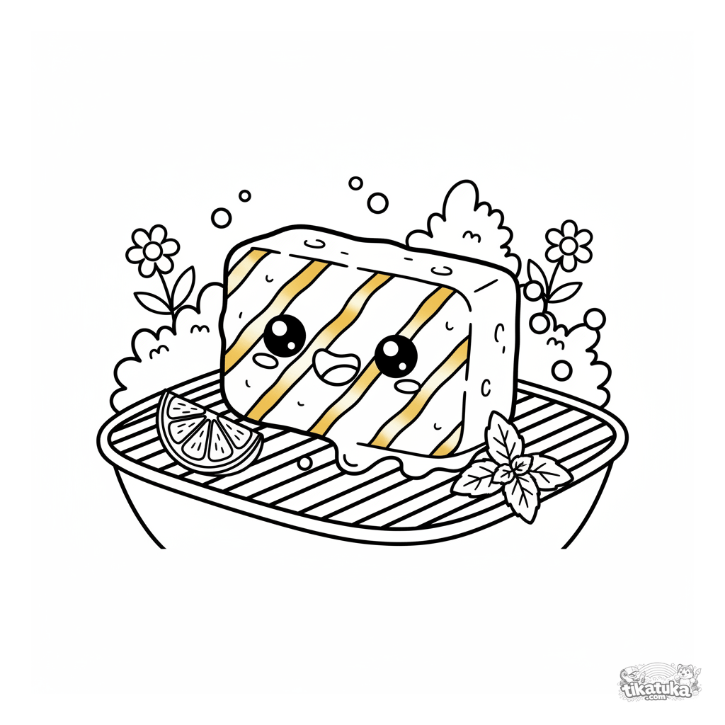 Página para colorir para 4-6 anos: uma fatia feliz de queijo halloumi com marcas de grelha em um jardim. Formas simples.