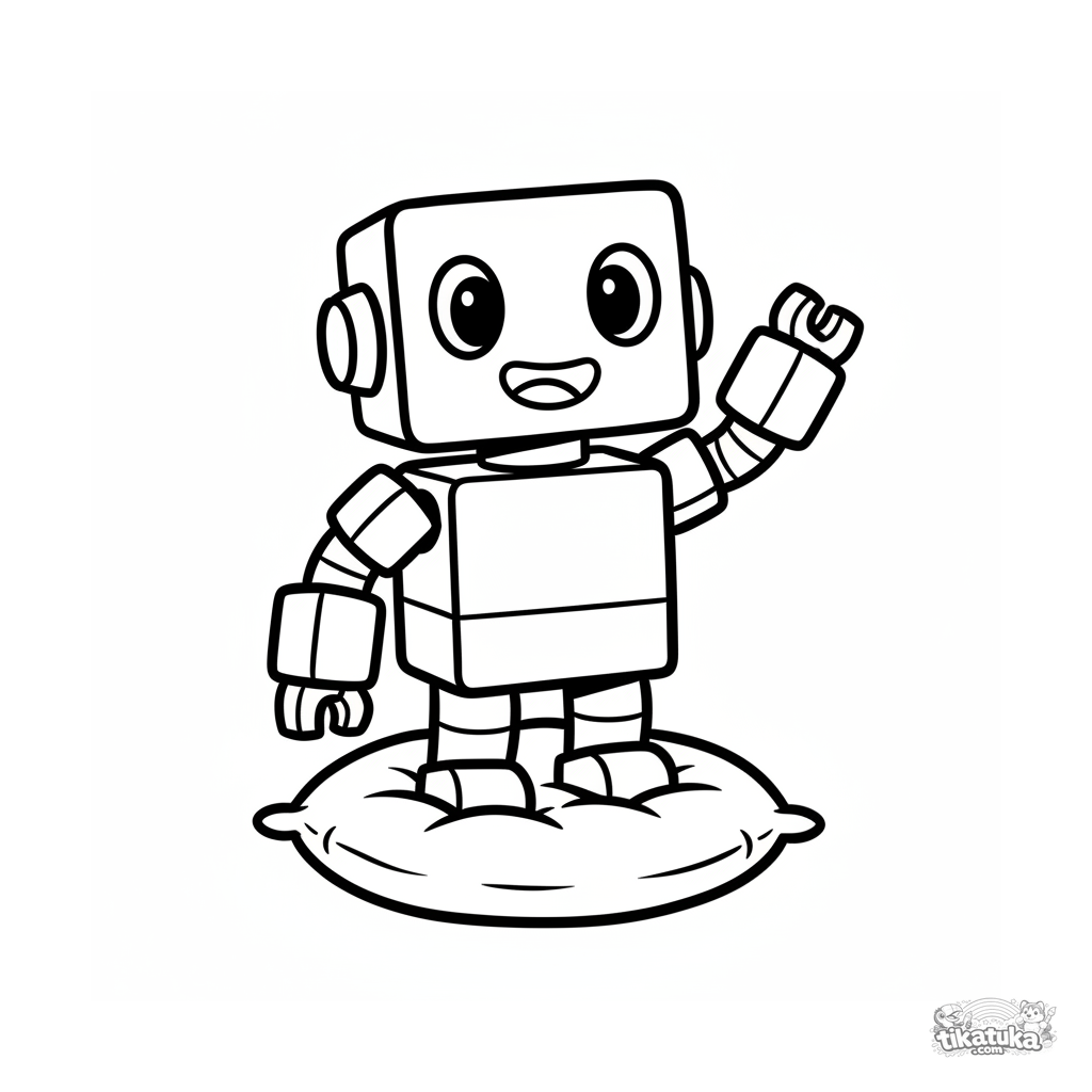 Página para colorir para bebês: um robô de bloco feliz acena enquanto está em um travesseiro macio. Formas grandes e simples.