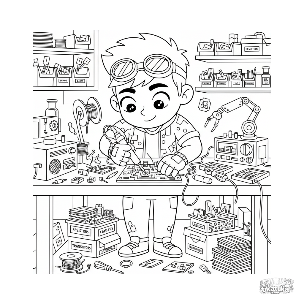 Página para colorir detalhada para 10-12 anos: um modificador de hardware soldando uma placa em uma oficina no porão. Muitas ferramentas, caixas de peças, dispositivos desmontados.