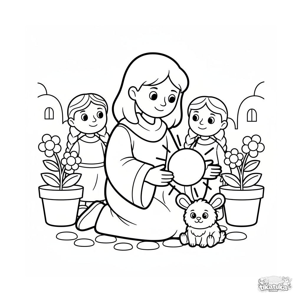 Página para colorir para crianças pequenas 2-3: um herói curandeiro com mãos brilhantes ajuda um animal numa praça. Formas simples, detalhes grandes.