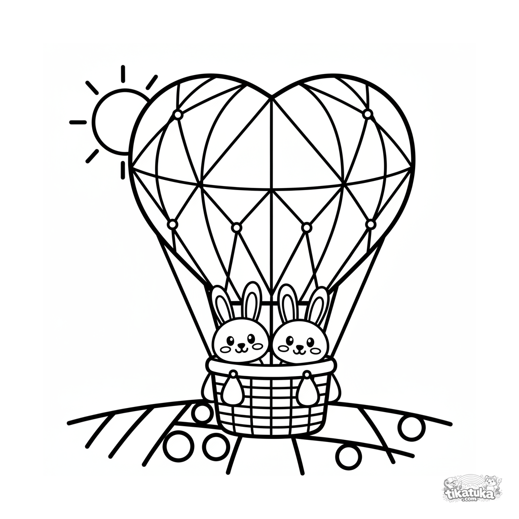Página simples para colorir para crianças pequenas: um balão em forma de coração flutua sobre um prado. Dois coelhos estão na cesta. Formas grandes, margens amplas.