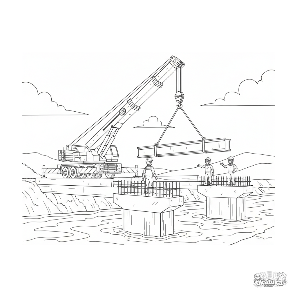 Página para colorir detalhada para meninos de 10-12 anos: um caminhão guindaste poderoso envolvido na construção de uma ponte sobre um rio.
