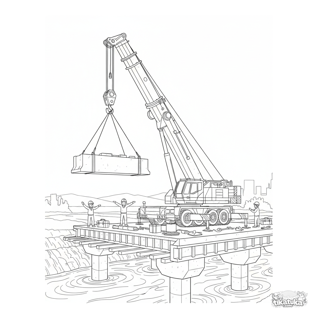 Página para colorir complexa para 10-12 anos: um guindaste detalhado trabalhando na construção de uma ponte sobre um rio. Para amantes de máquinas.
