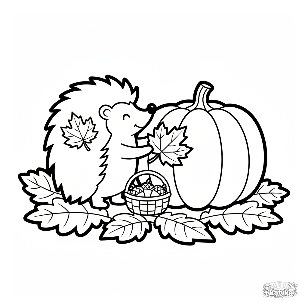 Página simples de outono para colorir para crianças pequenas de 2-3 anos: um ouriço fofo decora uma abóbora grande com folhas caídas coloridas.