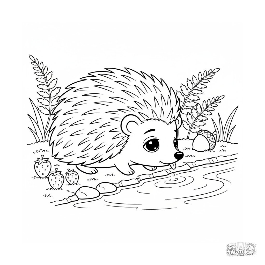 Página para colorir para crianças de 4-6 anos: um ouriço fofo agacha-se na beira de um riacho claro para beber, com frutas silvestres por perto.