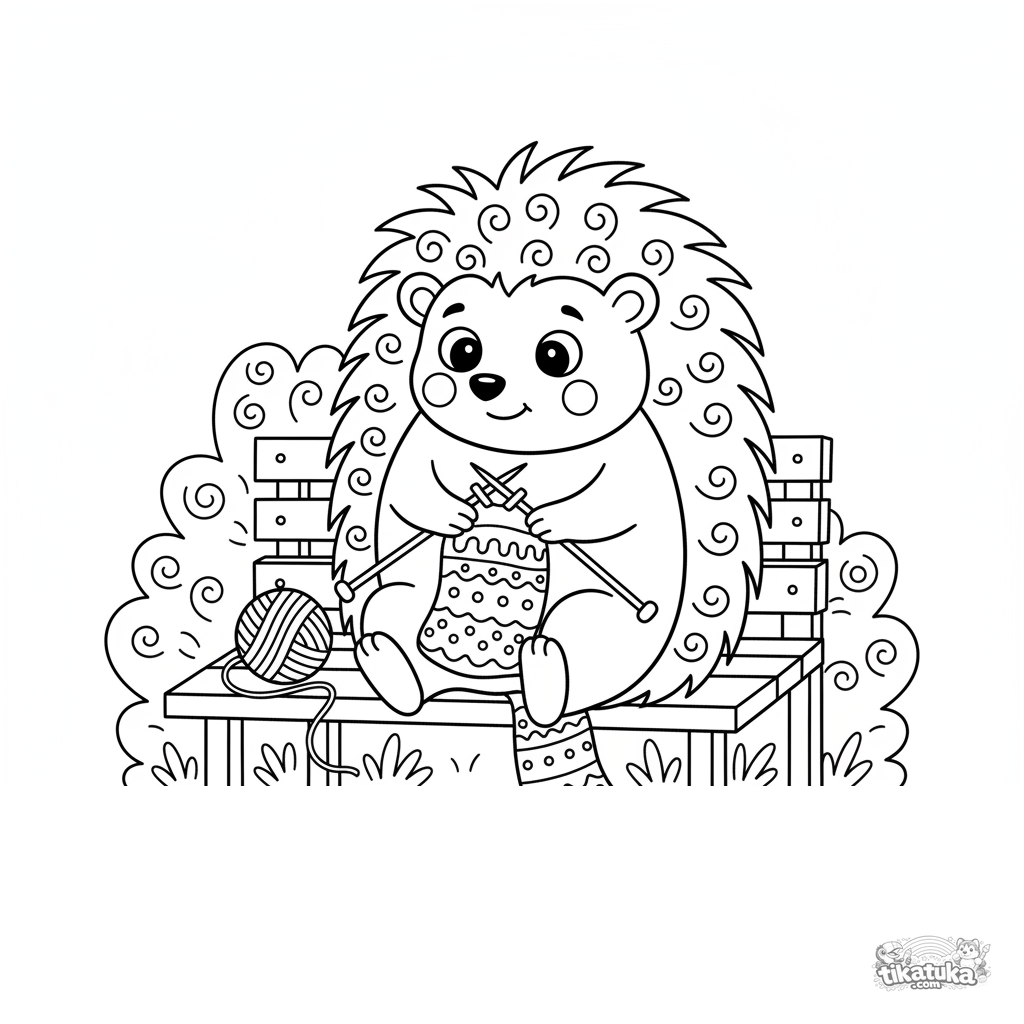 Página para colorir para crianças 7-9: um ouriço tricotando um cachecol em um banco de parque outonal. Cena aconchegante em estilo folclórico.