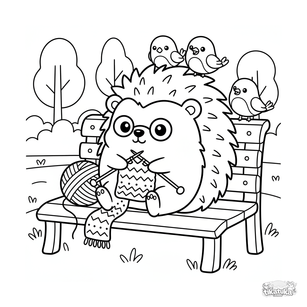Página para colorir para crianças de 4-6 anos: um ouriço fofo tricotando um cachecol. Estilo kawaii, composição simples.