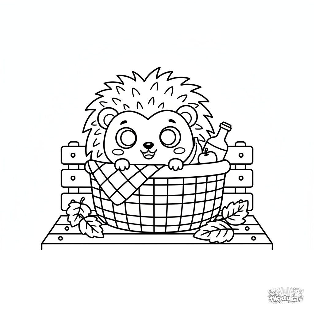 Página para colorir para crianças de 4-6 anos: um ouriço chibi fofo espreita de uma cesta de piquenique em um banco de parque.