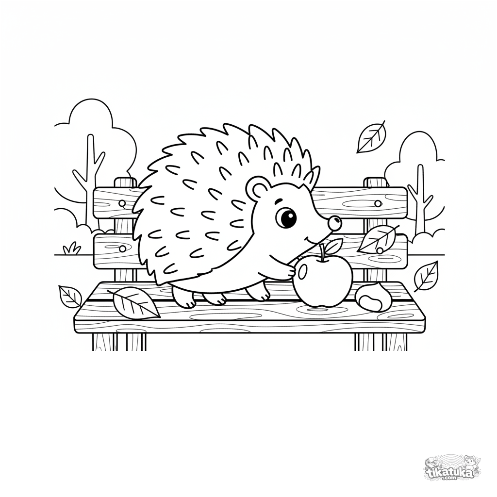 Página para colorir para crianças 4-6: um ouriço no banco do parque tentando lidar com uma maçã grande, com folhas de outono e uma castanha por perto.