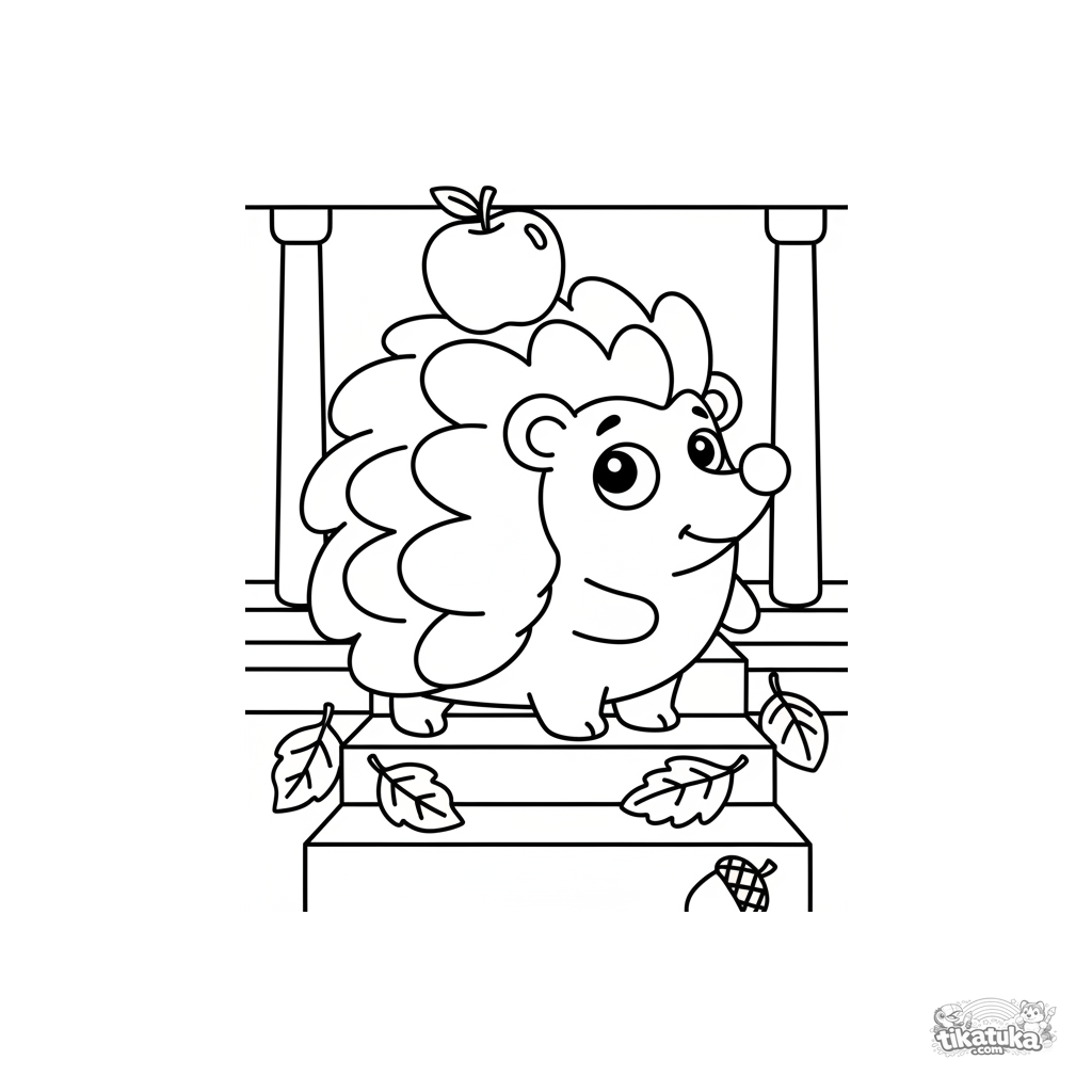 Página simples para colorir para bebês 2-3: um ouriço carrega uma maçã nas costas nos degraus de madeira de uma varanda. Formas grandes e amigáveis.