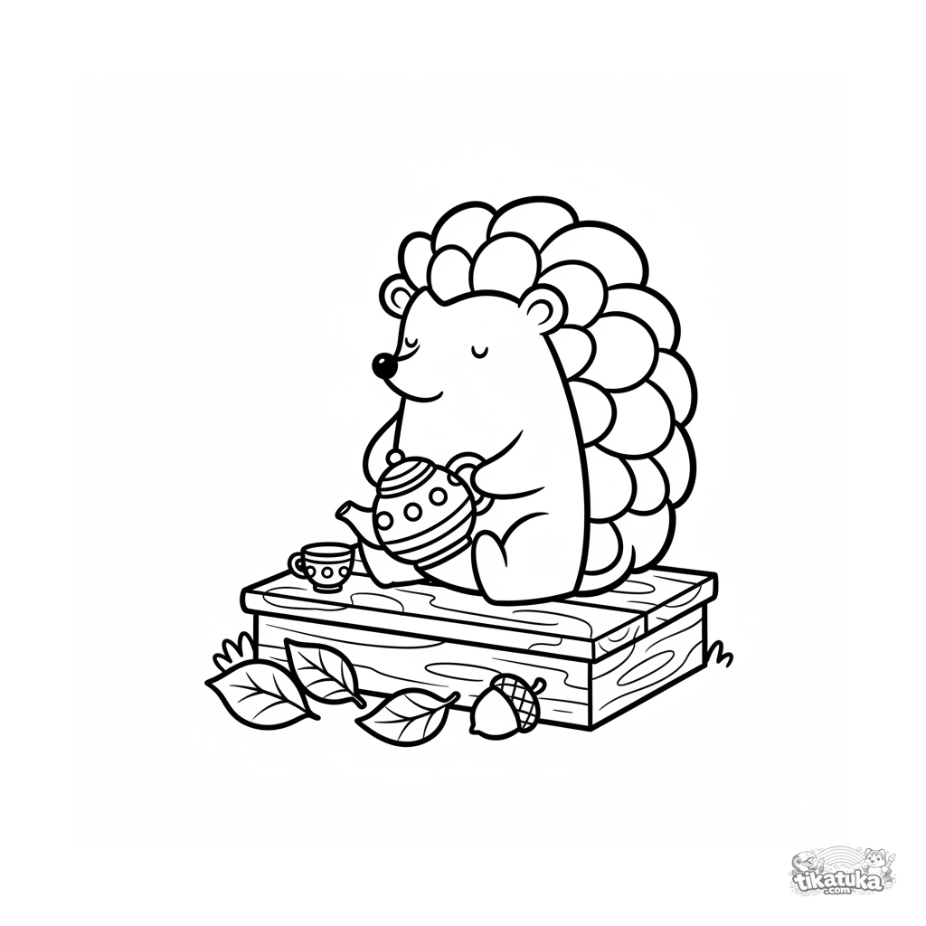 Página simples para colorir para crianças pequenas: um ouriço serve chá em um degrau da varanda. Formas grandes e fechadas, margens amplas.