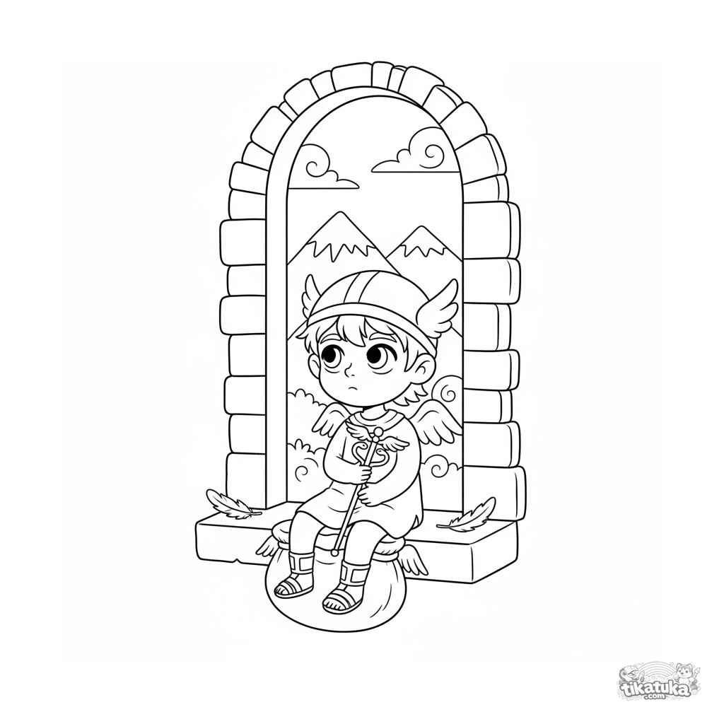 Página para colorir estilo anime para 7-9 anos: um jovem Hermes descansa em uma bolsa de nuvem perto de uma janela alta. Pose dinâmica, olhos expressivos.
