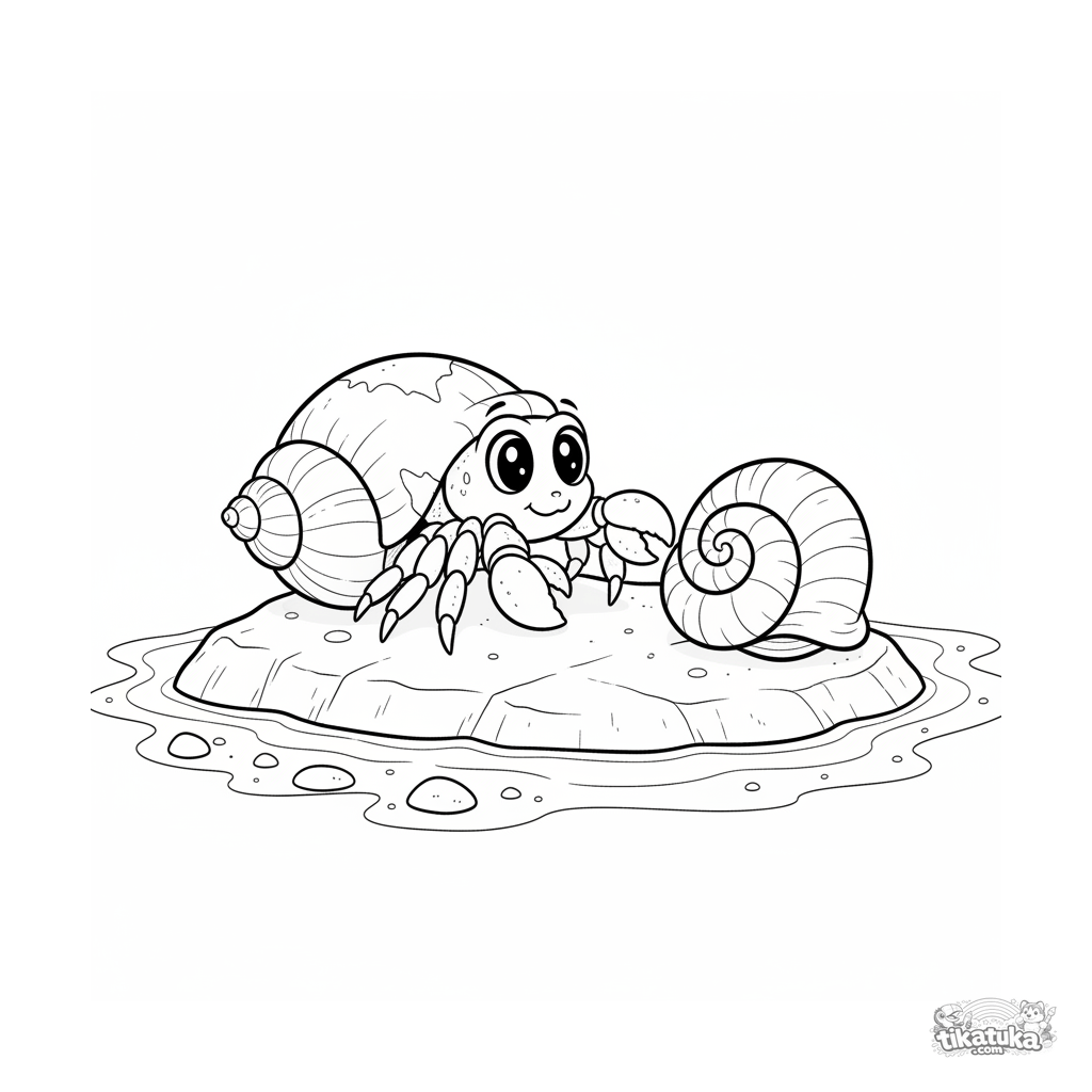 Página para colorir de um caranguejo-eremita se mudando para uma nova concha em uma poça de maré ensolarada. Para crianças de 7 a 9 anos.