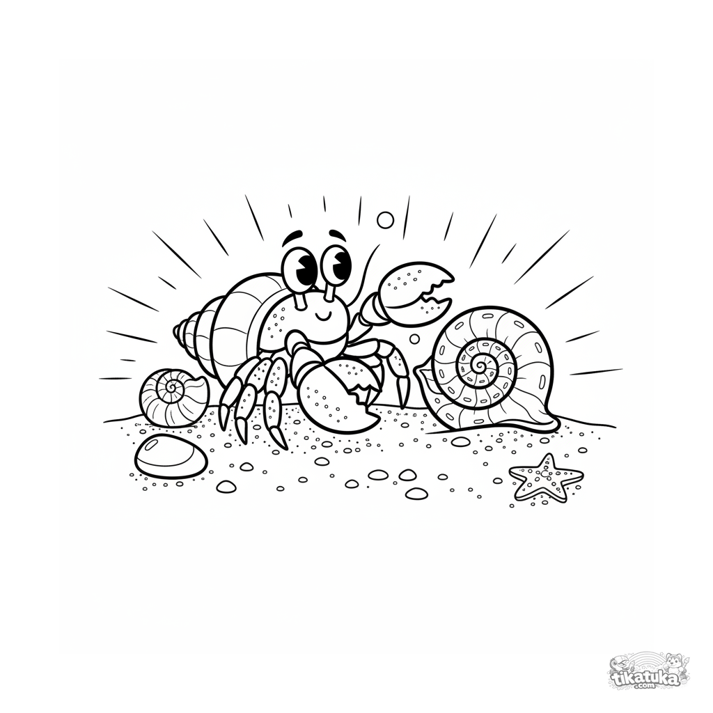 Página detalhada para colorir para 10-12 anos: um caranguejo-eremita escolhendo uma concha nova. Texturas, acessórios, cena complexa com raios de luz.