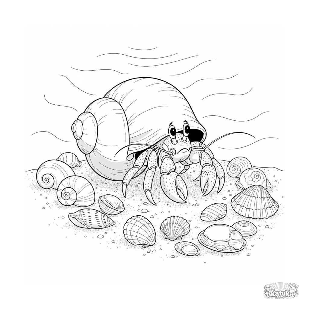 Página para colorir detalhada para 10-12 anos: Um caranguejo-eremita escolhendo uma nova casa entre conchas em um fundo do mar raso e ensolarado.